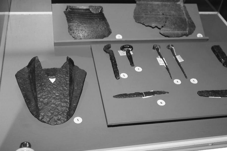 Культура хуннов. III в. до н. э. I в. н. э. (археологические раскопки у с. Дурены Республики Бурятия). Из экспозиции Музея истории Бурятии им. М.Н. Хангалова. 1). Сошник. Железо (с. Дурены, А.В. Давыдова, 1979). 45). Шилья. Железо (с. Дурены, А.В. Давыдова, 1979). 6). Нож. Железо (с. Нижние Дурены, А.В. Давыдова, 1979). Фото автора