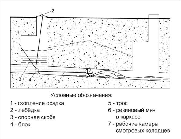 Засоры в коллекторах устраняются тралением специальными устройствами (шар, «кошка», цилиндр), расчисткой с помощью ручного инструмента и малых средств механизации или пропуском большого расхода воды, который вымывает скопившийся мусор.