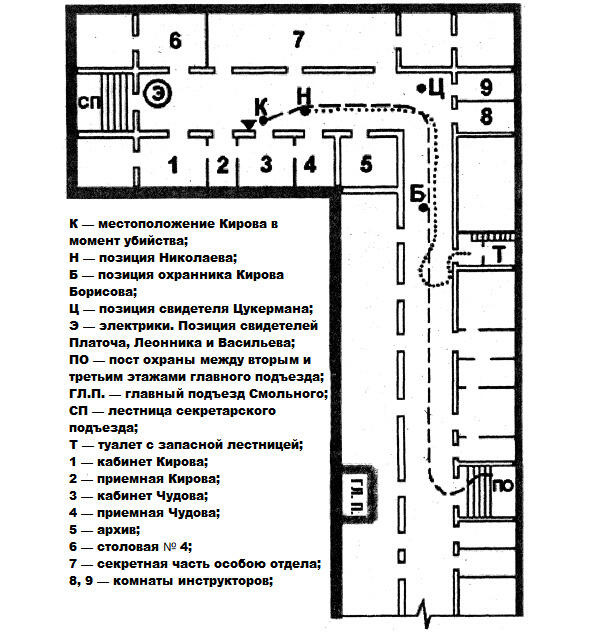 [Поднявшись на третий этаж, я зашел в уборную, оправился и, выйдя из уборной, повернул налево (т. е. направился к выходу, А.К.). Сделав два-три шага, я увидел, что навстречу мне по правой стене коридора идет Сергей Миронович Киров на расстоянии 1520 шагов. Я, увидев Сергея Мироновича Кирова, остановился и отвернулся задом к нему, так что когда он прошел мимо, я смотрел ему вслед в спину. Пропустив Кирова от себя на 1015 шагов, я заметил, что на большом расстоянии от нас никого нет. Тогда я пошел за Кировым вслед, постепенно нагоняя его. Когда Киров завернул налево к своему кабинету, расположение которого мне было хорошо известно, вся половина коридора была пуста я подбежал шагов пять, вынув на бегу наган из кармана, навел дуло на голову Кирова и сделал один выстрел в затылок. Киров мгновенно упал лицом вниз.