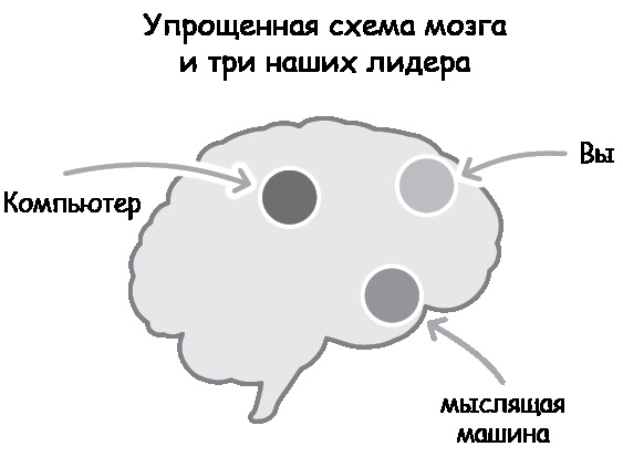 Если просканировать мозг во время работы, мы увидим, как светятся различные зоны и области, когда они активны. Попросту говоря, мы сможем лицезреть три команды в действии: вас, вашу мыслящую машину и Компьютер. В каждой из них, оказывается, есть свой лидер. Их можно представить в виде следующих структур:
