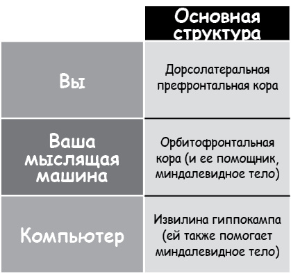 Компьютер ничего не интерпретирует этим он отличается от первых двух команд. Когда Человек и Шимпанзе начинают действовать и по-своему трактовать окружающий мир, они призывают Компьютер[12]. Он выступает в роли советчика, но при необходимости может также принять на себя руководство и действовать самостоятельно. Компьютер распределен по всему мозгу и воплощает многие аспекты функционирования этого органа, включая память и автоматические реакции. Его можно запрограммировать; он распознает паттерны и выдает решение в зависимости от ситуации. Таким образом, он формирует и хранит усвоенное поведение и убеждения. Подробнее нейробиология памяти рассматривается в разделе примечаний в конце книги[13],[14],[15],[16].
