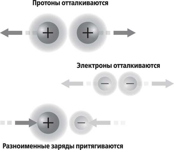 Электрон является носителем отрицательного заряда, а протон положительного. Разноименные заряды притягиваются друг к другу, одноименные отталкиваются. Это прекрасно видно на рисунке.