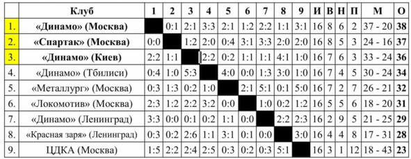 · Участники 9 команд, 164 футболиста. Проведёно 72 матча, забито 224 мячей. Лучшие бомбардиры Василий Смирнов «Динамо» (Москва), Леонид Румянцев «Спартак» (Москва), Борис Пайчадзе «Динамо» (Тбилиси) 8 мячей. Зафиксировано 7 автоголов, 25 пенальти, 19 удалений. Игры обслуживали 26 арбитров. Средняя посещаемость 28500 зрителей.