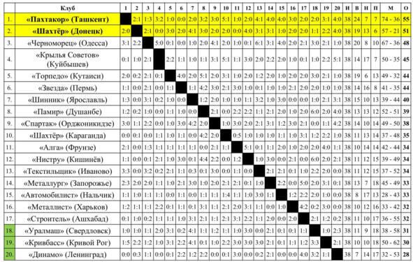 Система начисления очков: победа 2, ничья 1, поражение 0. Проведено 380 матчей, забито 895 мячей, лучший бомбардир Б. Абдураимов «Пахтакор» (Ташкент) 34 мяча, средняя посещаемость 12775 зрителей.