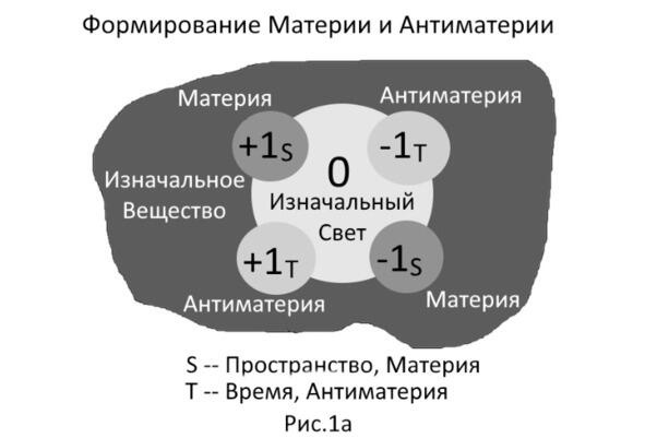 Давайте теперь подойдём к самому началу сотворения миров с математической точки зрения. Дело в том, что «целое», как и «пустое», можно разделить на две зеркальные противоположности, чтобы оно осталось таким же «целым». Приблизительно это будет выглядеть так: изначальное Вещество мы можем обозначить математическим символом «0», оно есть и его как бы нет; мы его далее разделяем на две противоположности «-1» как Антиматерия, и «+1» как Материя. Но далее мы их ещё разделяем по плоскостям состояния, что позволило нам получить четыре качества изначального Вещества: +S, -S, +T, -T. Это и показано на рисунке 1а, как четыре единицы, находящиеся в разных плоскостях состояний.