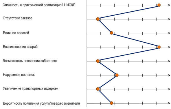 Для наглядной демонстрации возможно сформировать профиль риска. Таким образом становится возможным определить факторы, оказывающие наиболее негативное влияние и, соответственно, принять определенные меры по снижению вероятности возникновения рисков.