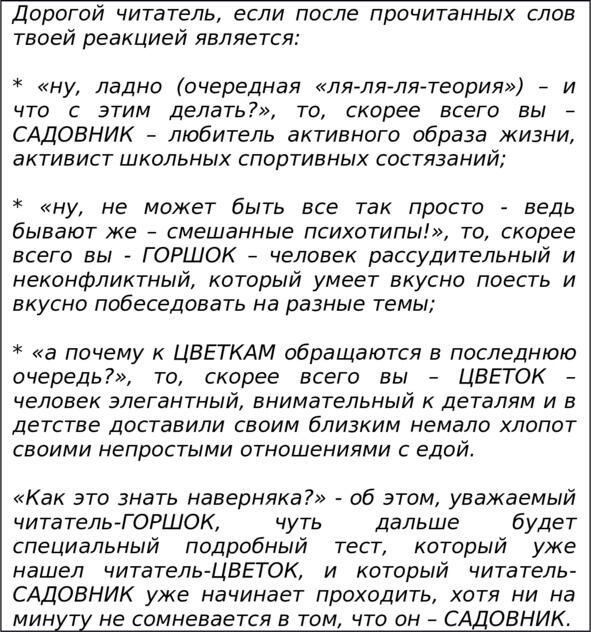 Люди стратегии «Сражайся» люди психотипа САДОВНИК воюют со всем и вся за быт, за уважение, за любовь. Они зачинатели любого вида «борьбы» начиная с «битвы за урожай», «борьбы за здоровый образ жизни» и заканчивая «борьбой за мир». Не найдя в супермаркете своей привычной колбасы, они попытаются вытребовать («выбить») эту колбасу из продавца, директора магазина, из министерства пищевой промышленности. В супружестве у них все так же четко и ясно или «разделение обязанностей», или «скандал как форма общения».