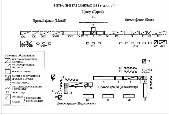 Персы специально выбрали поле для битвы, где они могли развернуть свои войска, почва была выравнена для действия колесниц и конницы (Curt., IV,9,10; Arr. An., III,8,7)99, а на флангах были высыпаны трибулы для нейтрализации вражеской конницы (Curt., IV,13,36; Polyaen., IV,3,17)100. Персидские военачальники довольно умело расположили свое многочисленное войско, которое по словам Арриана (Ап., 111,8,6), достигало 1 000 000 пехоты, 40000 всадников, так же имелось 15 слонов101. В центре, как обычно, встал царь с «родственниками» и мелофорами и другими азиатскими войсками, по бокам от них были построены греческие гоплиты (Arr. An., III,11,7). На флангах помещались конные отряды. Перед левым флангом персов, который должен был противостоять ударному правому крылу македонян, были поставлены (видимо, несколько ближе к центру) 100 серпоносных колесниц, к которым было добавлено около 1000 бактрийских и 2000 (?) сакских всадников (Arr. An., Ill, 11,6)102. Перед гвардейскими отрядами центра поставили еще 50 квадриг (Arr. An., III,11,6), видимо, никем не подкрепленных. Хотя Арриан (Ап., 111,11,6) и упоминает, что тут должны были стоять слоны, но, видимо, они были лишь в персидской диспозиции, захваченной после битвы македонянами, а в реальности они находились вне сражения, в лагере, где в конце боя и были захвачены (Arr. An., III,15,4). На поле боя слоны распугали бы прежде всего своих коней, непривычных к этим индийским животным103. Перед правым флангом царского войска стояло еще 50 квадриг, поддерживаемых армянской и каппадокийской конницей104. Персы, вероятно, предполагали охватить фланги македонян, поскольку здесь они имели значительный численный перевес в коннице, тогда как борьба с фалангой в центре, видимо, должна была носить оборонительный характер. И военачальники Дария не ошиблись в расчетах. Александр построил свою армию, состоящую из 40000 пеших и 7000 конных воинов (Arr. An., III,12,5), как обычно: шесть таксисов фаланги в центре, направо от них гипасписты, налево греческие союзники, на крыльях кавалерия: на правом гетайры, на левом фессалийцы, союзники и фракийцы. Для прикрытия тыла, за флангами, была построена вторая линия из вспомогательных войск, кроме того, перед гетайрами были поставлены метатели: агриане-пельтасты, лучники и дротикометатели Балакра105.