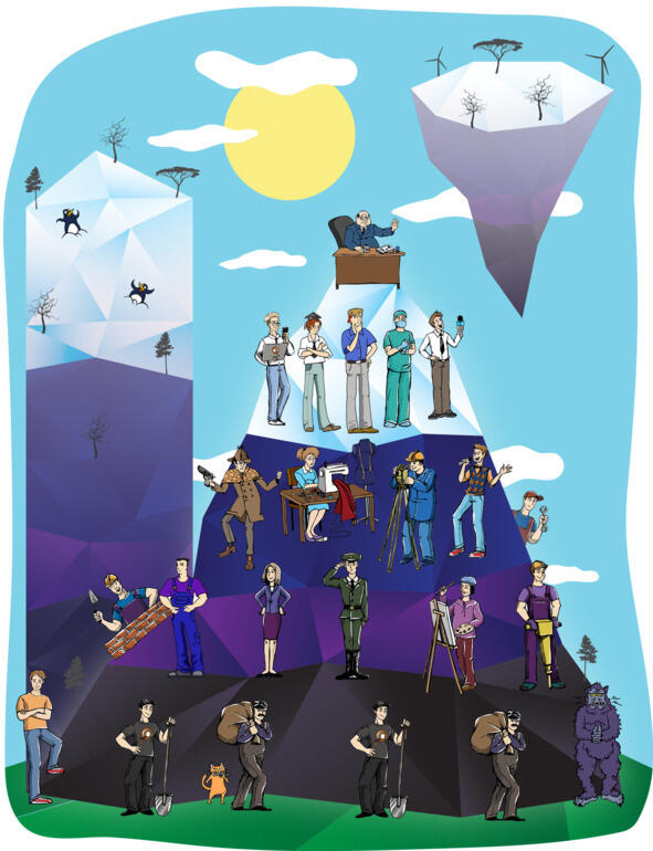 На следующем этаже располагаются творческие профессии это незначительная (0,35%), но немаловажная группа людей, занятых в сфере культура, досуга и СМИ.