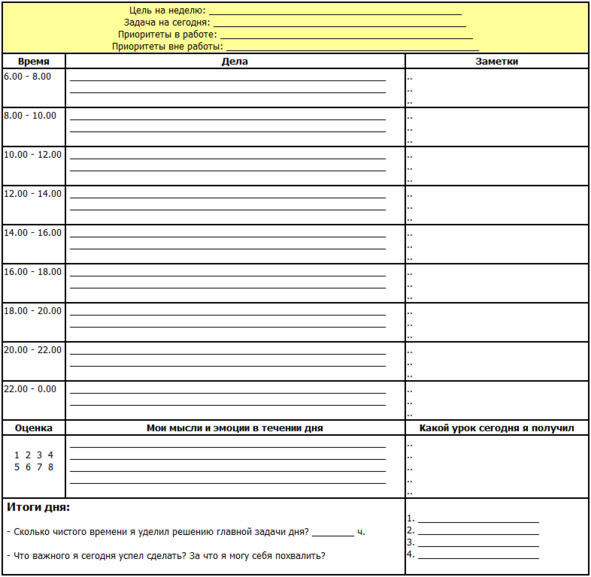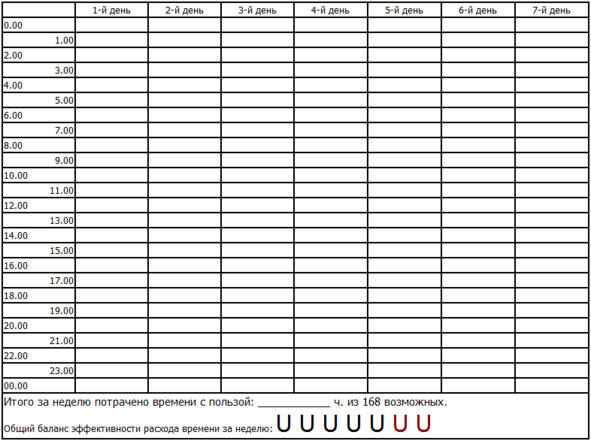 Время это деньги. Поэтому ведите ежедневный учёт времени и каждый вечер отмечайте в специальной таблице с помощью галочек, крестиков, заштриховываний, сердечек, букв или любых иных обозначений, сколько часов в день вы были заняты делом (тем, что ведёт вас к поставленным целям), сколько часов в день вы работали над собой (физические упражнения, дыхательные упражнения, развитие интеллекта, совершенствование профессионального мастерства), сколько часов у вас ушло на сон и сколько часов вы мило общались с близкими вам людьми. А в конце недели посчитайте, сколько всего времени вы потратили с пользой (при этом, сон и милое общение в кругу семьи без выяснения отношений записывайте туда же в качестве обязательных вложений в своё здоровье и благополучие):