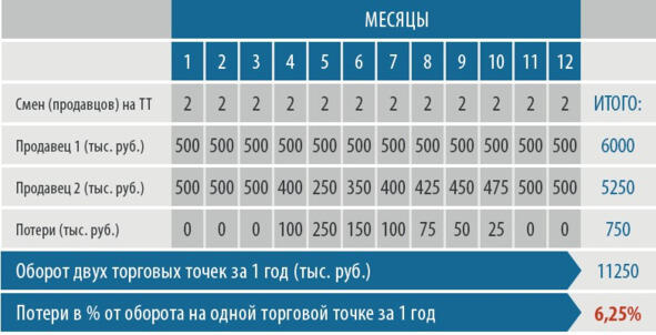 Но для упрощения расчетов мы возьмем, что обороты составляют 1 000 000 руб. в месяц на каждой торговой точке. И на этих торговых точках работают по 2 продавца (один в смену). Таким образом, 1 продавец за месяц продает на 500 000 руб.