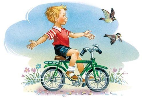 А я здорово научился ездить и довольно скоро стал делать на велосипеде разные штуки, как весёлые артисты в цирке. Например, я ездил задом наперёд или лёжа на седле и вертя педали какой угодно рукой хочешь правой, хочешь левой; ездил боком, растопыря ноги; ездил сидя на руле, а то зажмурясь и без рук; ездил со стаканом воды в руке. Словом, наловчился по-всякому.