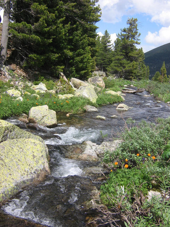 Наутро, миновав необычную проплешину горных верховий окружённую шерстью трав и усеянную моими любимыми огоньками стали валиться в распадочек с речным истоком. Экшен, который я уж точно не запамятую никогда: спуск по реке Сергезю!