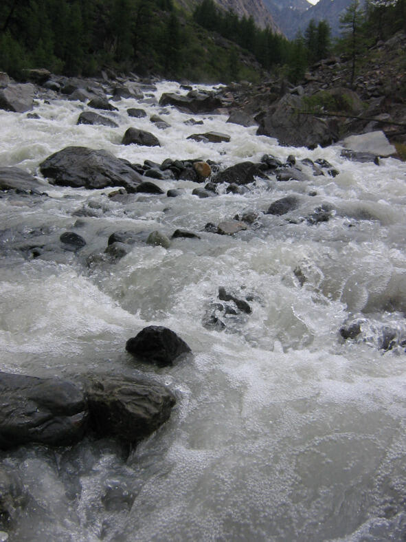 У самого устья Маашея туристы на стоянке нам предложили чаю, но соглашаться было несерьёзно, ибо мы ещё даже пороха не понюхали («ибо нехер!»). Все полезли в гору, а я спустился к речке и набрал голубоватой ледяной воды, заодно понаблюдав за процессом стирки: чувак запускал шмотки в реку, как это принято в походах, на длинной верёвке, а река их бешено полоскала. Я и сам такое практикую. Не всегда удачно (см. ниже в этой книге). Но в Эрлаголе, помнится, за какие-то двадцать минут Чемал великолепно сделал мне из сплошного куска грязи обратно чистенькие джинсики.