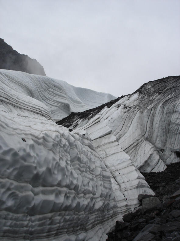 В торцевой стене протаяли причудливые ходы и пещеры. Не глубоко, на метр-два внутрь, но туда можно забраться. Что тоже небезопасно, сверху нависают фигурные глыбы с автомобиль весом. Кто знает, когда они оборвутся А сбоку змеятся и врезаются в морену волнистые фирново-ледовые слои, пластами лежащие друг на друге и так десятки метров в высоту. Ну, сущая перина для какого-нибудь Инеистого Великана, а может и для самого Имира! Нет слов и эпитетов, чтобы передать всю красу необычайного творения природы.