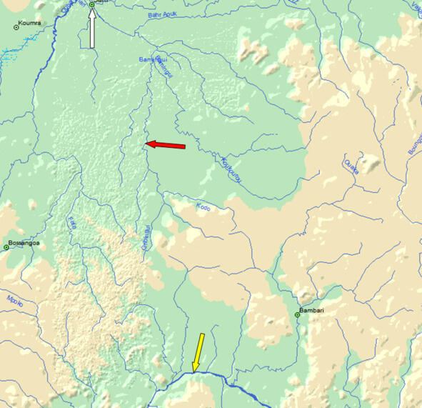 Диапазон территорий, охватываемых описаниями в данной главе: форт Аршамбо (северная граница диапазона) белая стрелка; река Убанги (южная граница диапазона) красная стрелка. Река Конго (за пределами диапазона) желтая стрелка
