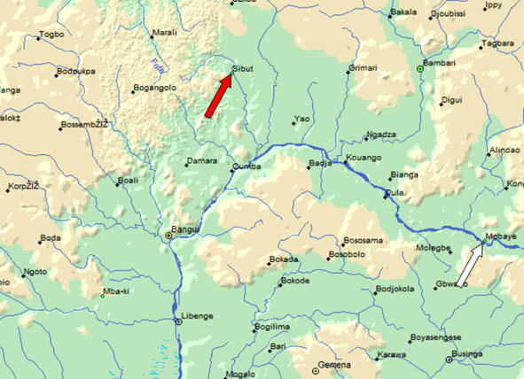 Кеммо (в настоящее время Sibut) красная стрелка; Моббай (Mobaye) белая стрелка