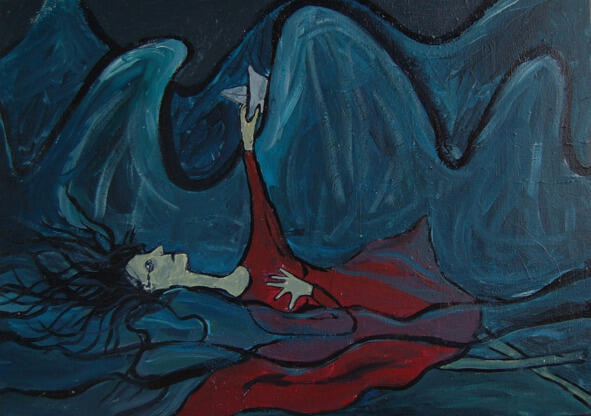 Не замечая, что тонет, женщина продолжает вести свой бумажный кораблик через шторм