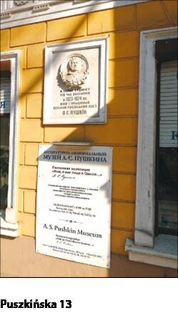 Kamienica pod numerem 13 stała się poniekąd sprawczynią tego, że ulica zmieniła nazwę z Włoskiej na Puszkińską. Była ona wybudowana w 1821 roku i początkowo znajdował się w niej hotel Du Nord, w którym na miesiąc, po przybyciu do Odessy 3 lipca 1823 roku, zatrzymał się Aleksander Puszkin. Obecnie znajduje się w nim muzeum im. Puszkina, które otwarto 18 lipca 1961 roku. Przed kamienicą 4 czerwca 1999 roku postawiono pomnik wielkiego rosyjskiego poety. Puszkin Aleksander Siergiejewicz był jednym z najwybitniejszych rosyjskich pisarzy i przedstawicieli romantyzmu rosyjskiego oraz klasyków literatury rosyjskiej.