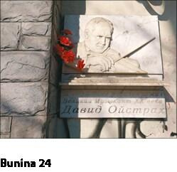 Wróćmy jednak na ziemię i skierujmy nasze kroki w stronę kamienicy numer 24 przy ulicy Bunina. Kamienica została zaprojektowana w 1825 roku przez Giovaniego Frapolli, młodszego brata Franza Frapolli. Kamienica, należała niegdyś do rodziny Falz-Feinów, do której należał również m. in. słynny dom z atlantami przy ulicy Gogola. Tam jeszcze, oczywiście, dojdziemy, a teraz zwróć uwagę na pamiątkową tablicę na fasadzie kamienicy poświęconą jednemu z najwybitniejszych mieszkańców Odessy, radzieckiemu skrzypkowi żydowskiego pochodzenia, absolwentowi muzycznej szkoły profesora Piotra Stolarskiego, Dawidowi Fiodorowiczowi Ojstrachowi. Urodził się on w tej kamienicy 30 września 1908 roku i mieszkał do 1932 roku do czasu wyjazdu do Moskwy. Tablicę odsłonięto w 2003 roku.