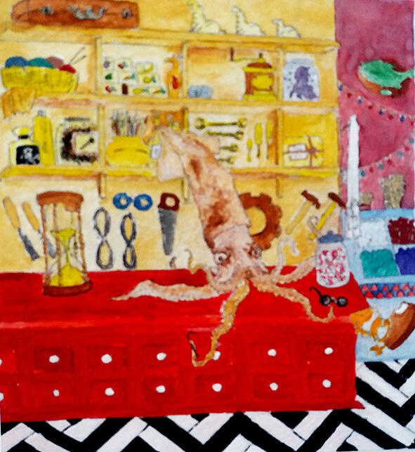 И кальмар скрылся у себя в кладовке. Только было слышно, как он что-то бурчит себе под нос, чем-то стучит, жужжит и тихонько хохочет.