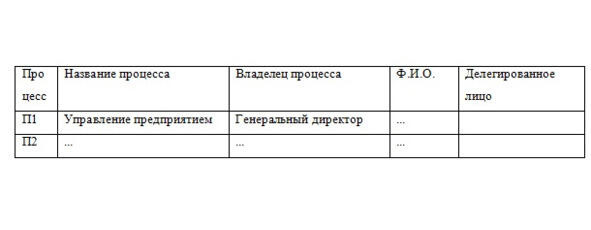 К вопросу делегированных лиц Вы подойдете в любом случае, учитывайте это сразу, пока графа пусть останется пустой (Перечень Владельцев процессов пойдет приложением к Приказу об их назначении, позже внесете в него изменения).