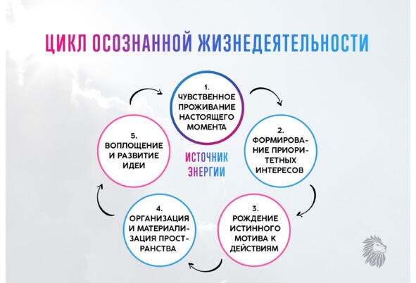 Что следует понимать под понятием осознанной жизнедеятельности? «Осознанная» значит правильная, то есть соответствующая оптимальному варианту и максимально включенная. «Жизнедеятельность» это вся наша жизнь, все действия, которые мы совершаем по мере существования в нашем мире. Поэтому цикл осознанной жизнедеятельности представляет собой процесс из пяти пунктов в оптимальном варианте: с минимальными затратами энергии, наибольшим количеством приятных эмоций и без деструктивных переживаний и состояний.