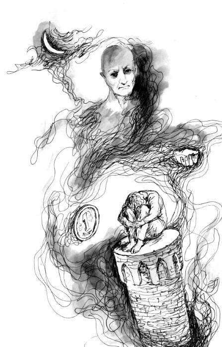 Вона згорбилася, притиснула долоні до живота і, тягнучи ноги, побрела кудись геть, у темряву, вгору ледь помітними гвинтовими сходами. Юстин уражено дивився їй услід.