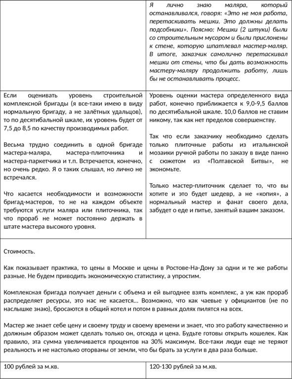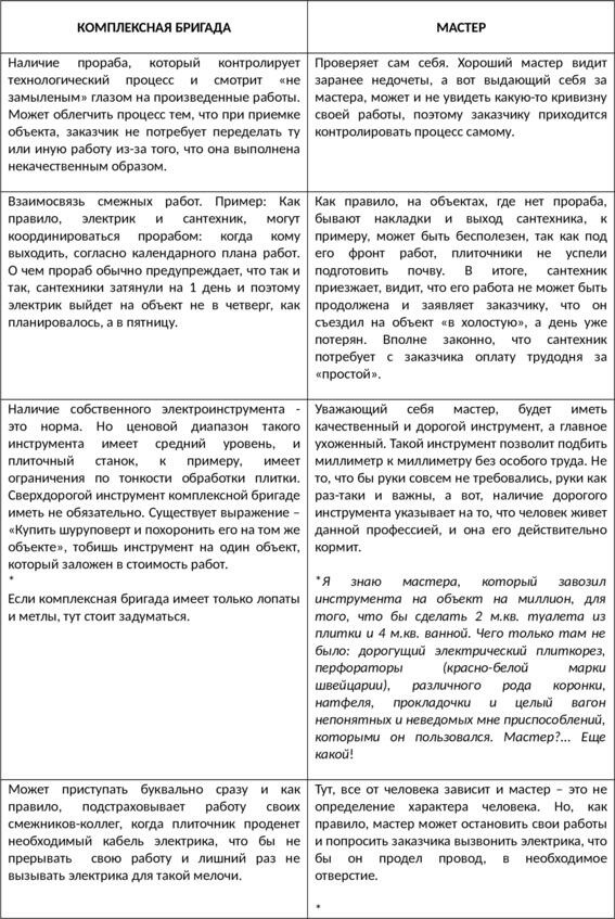 И еще один момент. Возможно, что объект ведет комплексная бригада, но вот бригадный плиточник не может сделать должным образом то, что планируется на объекте. Грамотный прораб наймет мастера-плиточника, который сделает определенный вид работы, а маляры, электрики и сантехники, продолжат свои работы в составе команды комплексной бригады, а бригадный плиточник будет делать менее квалифицированные плиточные работы на данном объекте. Бывает и такое.