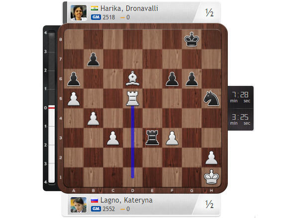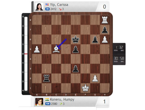 19. b3 f6 20. Ne6 Nxe6 21. dxe6 Bxe6 22. Bc4 Nc7 23. Nb5 Qd7 24. Nxc7 Bxc4 25. bxc4 Qxc7 26. Qb3 Qxc4 27. Bxa5 Qxb3 28. Rxb3 Rf7 29. Rfb1 Rb8 тут времени у Хампи оказалось менее минуты, но она нашла план победы 30.Bd2!