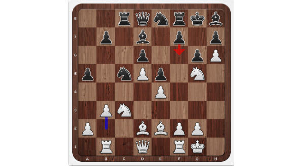 1.e4 c5 2. Nf3 d6 3. d4 cxd4 4. Nxd4 Nf6 5. Nc3 a6 6. Be3 Ng4 7. Bc1 Nf6 8. a4 g6 9. Be2 Bg7 10. O-O O-O 11. Be3 Nc6 12. Qd2 Bd7 13. f4 Rc8 14. Kh1 Re8 15. Rad1 Qa5 16. Nb3 Qb4 17. e5 Ne4 18. Nxe4 Qxe4 19. a5 Qb4 20. Bf3 Be6? Плохой ход. Лучше было бы сыграть 20. Qxd2 21. Rxd2 Be6