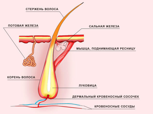 Ресницы, как и прочие волосы, имеют стержень и корень. Корень заканчивается волосяной луковицей. Именно она ответственна за рост ресниц.