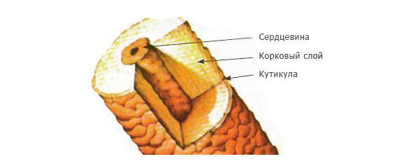 1) Сердцевина волоса имеет также иное название, «мозговое вещество». Она состоит из белковых веществ и кератина.
