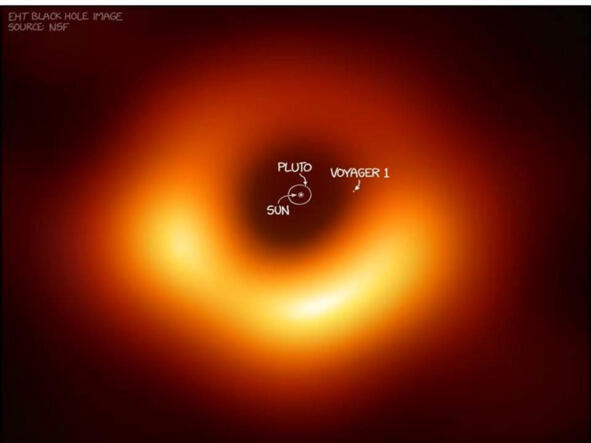 Первый в истории снимок черной дыры в галактике М87. Для сравнения в центре кружком обведена вся Солнечная система