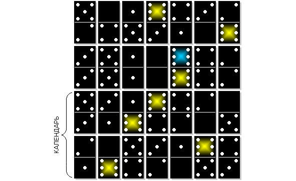 Повернём матрицу Послания (см. рисунок 3.1a) влево на 90 градусов. Используем чёрное домино с белыми точками. Отметим все половинки домино с шестью очками (точками)