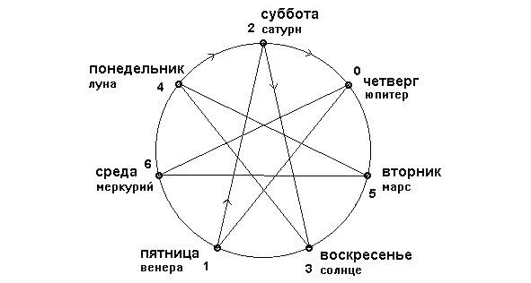 Эта последовательность дней недели представлялась семиконечной звездой, вписанной в круг (так называемой звездой магов).