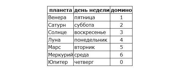 Далее, вместо знаков планет я буду использовать названия планет и их соответствие числам домино и дням недели в календарной таблице. Для этого я объединил данные из таблицы 1 и таблицы 2 и получил следующую таблицу.