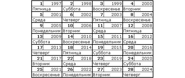 Далее все повторяется. То есть календарь на 2025 год полностью совпадёт с календарём на 1997 год; календарь на 2026 год совпадёт с календарём на 1998 год и т. д. Таблица позволяет определить календарь на любой год в прошлом и будущем. Поэтому Таблицу Солнечного цикла и называют Вечным календарём.