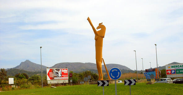 Километров через пять останавливаюсь на красный светофора, и смотрю, как очень большая группа велосипедистов пересекает автотрассу по велодорожке. Еду прямо, не заметив, что съехал с велодорожки. Лучше было бы ехать за группой. Но еду прямо и через пять километров останавливаюсь на перекрёстке у въезда в городок Алькудия. В ожидании на красном рассматриваю и фотографирую скульптуру, изображающую кого-то, похожего на коня, стоящего на задних ногах.