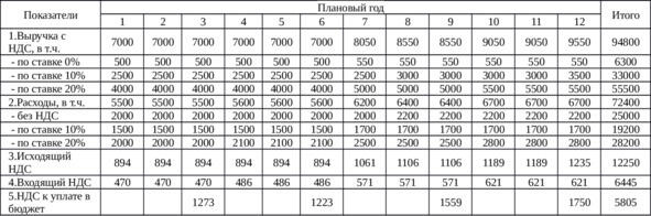 Исходящий НДС определен с учетом ставок налога. Например, в первый месяц он составит 894 тыс.руб. (0×500+0,0909×2 500+0,1667×4 000=894).
