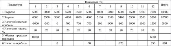 Убытки прошлых периодов на начало года равны 10 млн руб. Они значительно больше прибыли за весь год. К вычету можно принять только 3 400 тыс.руб. (0,5×6 800=3 400). На конец года убытки прошлых периодов составят 6 600 тыс.руб. (10 000- 3400=6 800). Налог на прибыль составит 680 тыс.руб. (0,5×0,2×6 800).