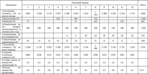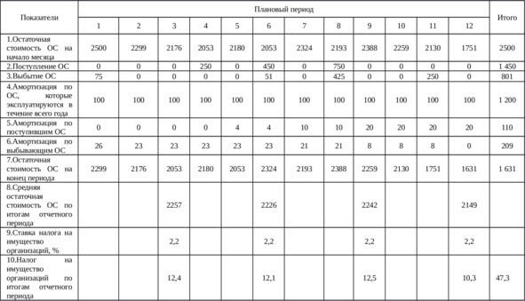 Средняя остаточная стоимость основных средств определена как среднеарифметическое её величины на начало и конец месяца. Например, в первый месяц средняя остаточная стоимость основных средств составит 2 400 тыс.руб. ((2 500+2 299) /2=2 400).