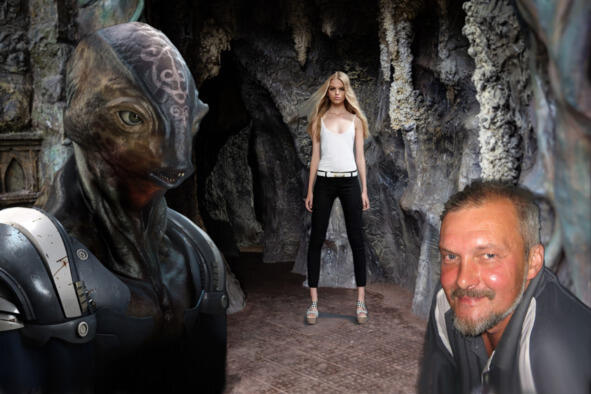Саша: Он подходит к столу, накапал воску со своей свечи на стол, прилепил ее недалеко от той, что уже стояла, и сбросил капюшон. И я вижу, что это не человек. У него очень интересное лицо: узкий подбородок, большой лоб, большая круглая голова без растительности, носа нет, а что-то типа кожаного лепесточка и от дыхания он шевелится, ушей тоже нет, и поразительно, большие, абсолютно черные, круглые, без белков глаза, очень маленький рот, причем, насколько я помню, он его ни разу не открыл. Я ошарашен был таким видом, но в это мгновение он выбросил руку в сторону стены, и говорит: «Смотри!» Резко так сказал. Телепатически