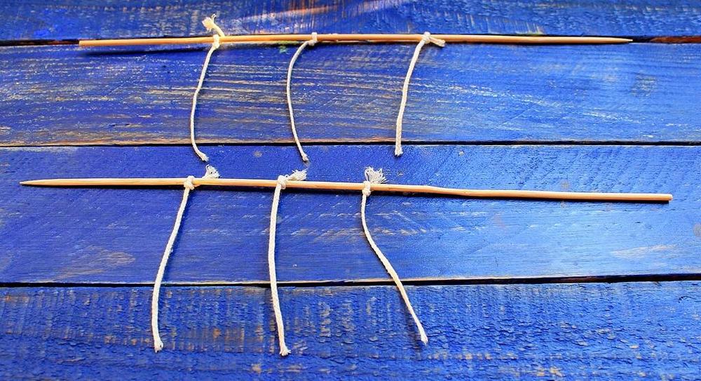1. На первом шаге привязываем фитили по количество скорлупок-форм к деревянной (или любой другой) палочке. Удобно использовать одну палочку для нескольких свечек, стоящих в ряд. Тем более что уровень палочки должен быть немного выше, чем яичные верхушки, чтобы потом не развязывать фитиль, а просто обрезать.