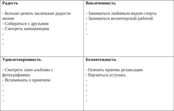 Что вы могли бы сделать, чтобы обогатить четыре аспекта вашего счастья? Дополните следующую таблицу, своими собственными мыслями: