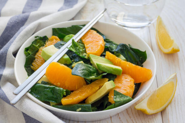 Затем фрукты смешиваем с листьями шпината, добавляем авокадо и заправляем салатной заправкой из сока апельсина, кленового сиропа или мёда и растительного масла. Сверху посыпаем грецким орехом. Приятного аппетита!