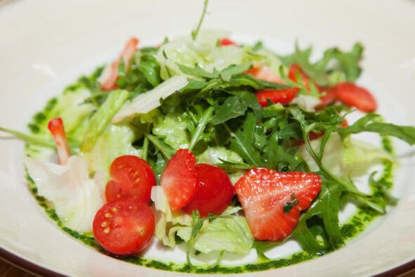 Все ингредиенты промыть. Салат Айсберг и рукколу просушить. Клубнику нарезаем дольками или пополам, в зависимости от размера. Томаты режем ломтиками или пополам, если вы используете томаты черри.