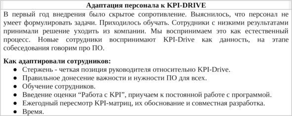 Я хочу привести такой пример, который на сегодняшний день у нас является показательным. Наш директор по производству сменил место жительства и уехал трудиться в Москву. И сейчас он пишет нам о том, что в той компании, в которой он сейчас работает, пытаются внедрить KPI-показатели. И там у всех сотрудников паника. А наш бывший директор по производству, помогая и разъясняя, говорит им: «В системе KPI-мотивации ничего страшного нет, она несет в себе только преимущества: мы все будем работать на одну задачу и станем результативными».