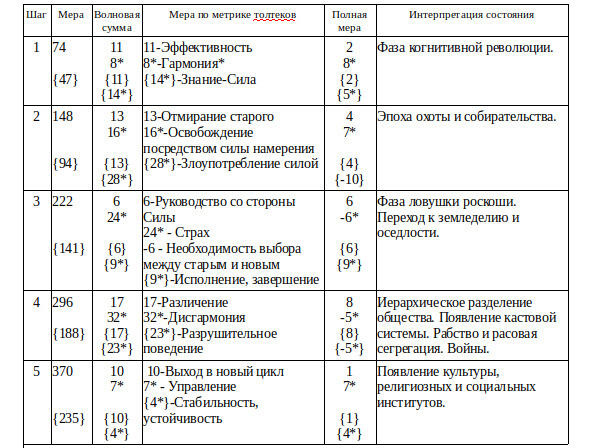 Закономерности матриц одни и те же для изучаемых процессов разных масштабов. Однако, их интерпретация будет отличаться. В таблице даны интерпретации для исторического процесса всего человечества в целом.