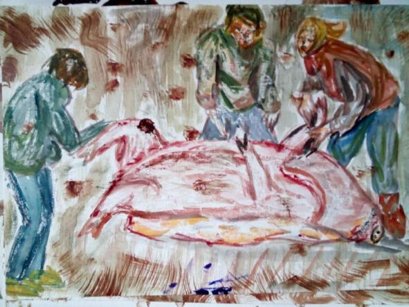 Пока он размышлял и любовался сказочной красотой, его мысли прервали советник со слугами. Друг подъехал к нему со свитой и поперек одной лошади лежал огромный кабан с клыками, по которым на снег стекала свежая кровь. Кровь струилась из раны и белый снег становился красным.